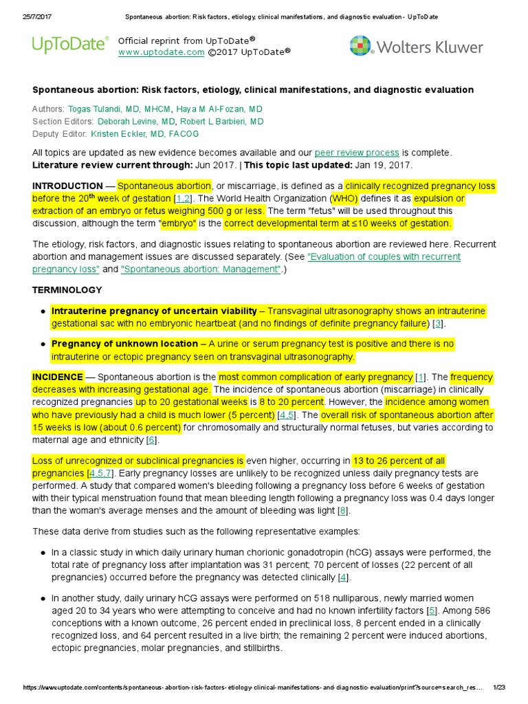 The terms spontaneous abortion and miscarriage are synonymous and are defined as loss of the fetus before the twenty eighth week of pregnancy. Spontaneous conception in couples with unexplained infertility could be related either to the stress relief after the decision to abandon the therapy or to the placebo effect after being placed in the waiting list before starting the treatment. Diagnosis is by clinical criteria and ultrasonography. Spontaneous abortion is noninduced embryonic or fetal death or passage of products of conception before 20 weeks gestation threatened abortion is vaginal bleeding without cervical dilation occurring during this time frame and indicating that spontaneous abortion may occur in a woman with a confirmed viable intrauterine pregnancy.