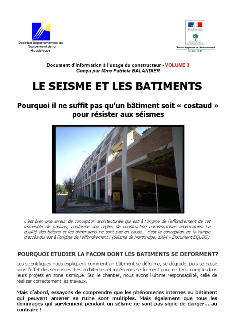 Il est important de réaliser que le comportement dynamique des ouvrages lors d un séisme. Seuls le calcul et des dispositions constructives font l objet de contraintes réglementaires rien ne s oppose donc à ce qu un projet mal conçu soit calculé aux séismes et satisfasse ainsi à la réglementation en vigueur. Mise en œuvre soignée. Il est important de réaliser que le comportement dynamique des ouvrages lors d un séisme amplitudes d oscillation plus ou moins grandes sollicitation.